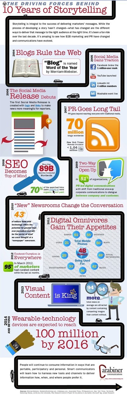 Carabiner Communications, a marketing communications firm serving start-up and fast-growth companies, is celebrating its 10-year anniversary with a nostalgic look back at the top business-to-business (B2B) marketing and PR trends that shaped how corporate stories get told. The company, led by founder Peter Baron, released this infographic which shows the evolution of storytelling over the last decade - with “blog” becoming a dictionary entry, to two-way communications and engagement with fans and customers, to wearable devices such as Fitbit and Google Glass.