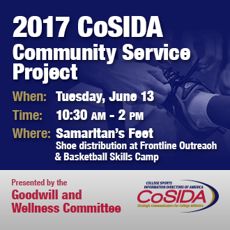 This year's CoSIDA Goodwill and Wellness Committee partners with Samaritan’s Feet for a shoe distribution and basketball skills camp on Tuesday, June 13. The event will start at 10:30 a.m. with both the shoe distribution and skills camp taking place at Frontline Outreach in Orlando.