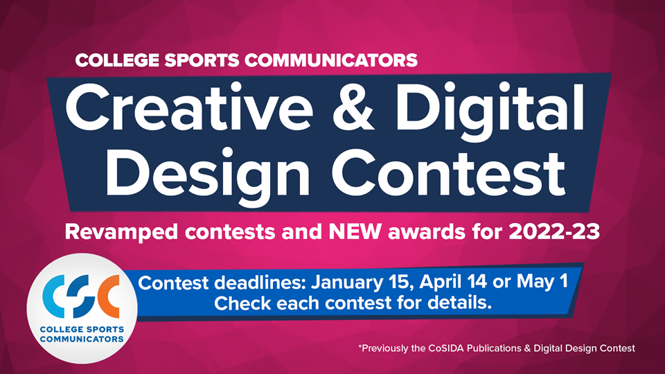 Each year, CSC recognizes outstanding work by the membership in the area of creative and digital design. Contests for 2022-23 have been revamped with new awards being offered. See below for all the details. These contests are open exclusively for current CSC members. Direct any questions to the contest coordinator or CSC Committee Chair Gene Cassell (gene.cassell@washburn.edu). See the bottom of this page for descriptions of each contest. Submit your entries at CollegeSportsCommunicators.com/Awards.