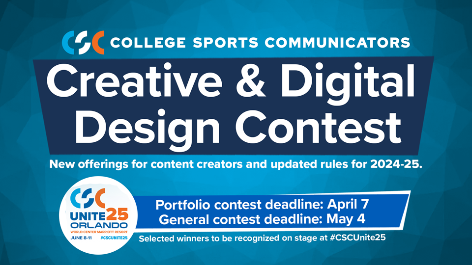This year, there are 17 categories available for CSC members to submit their work with each category split into University (NCAA Division I) and College (DII, DIII, NAIA, Two-Year Colleges, Canadian Institutions, all others) division entries for a total of 34 contests.